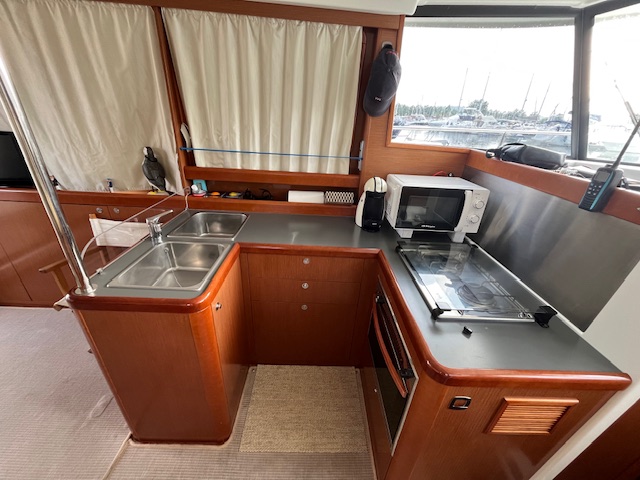 Además, el barco cuenta con una puerta lateral de acceso directo desde el puesto de gobierno, situada en el costado de estribor, una característica muy valorada para facilitar la maniobra en puerto y el movimiento a bordo.