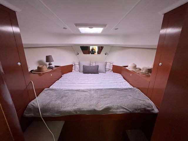 Camarote de armador, situado a proa, muy amplio, con cama doble, armarios y gran capacidad de estiba, ofreciendo un espacio privado acogedor y luminoso.
